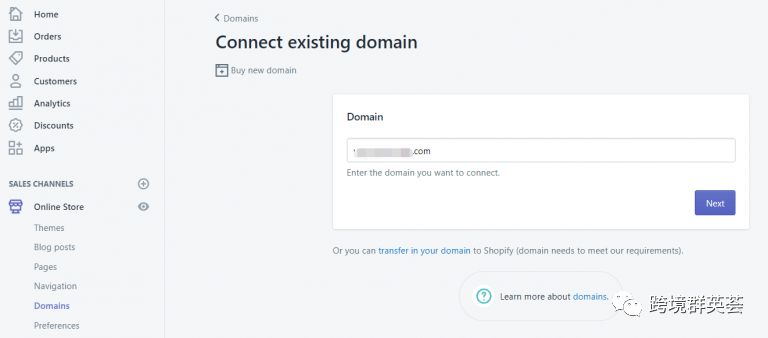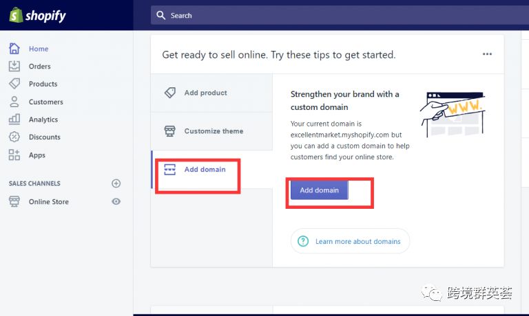 第1步:在Shopify后台找到Add domain 增加域名按钮点击进去。