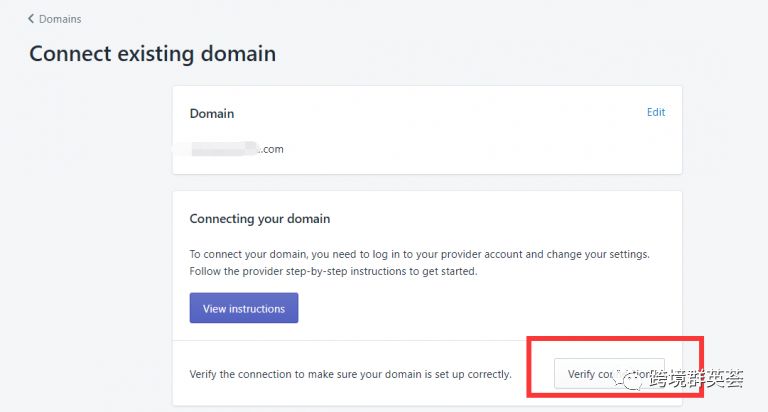 第八步:回到Shopify后台,点击Verify connection 验证连接,会提示Your domain was successfully connected 你的域名已经成功连接。
