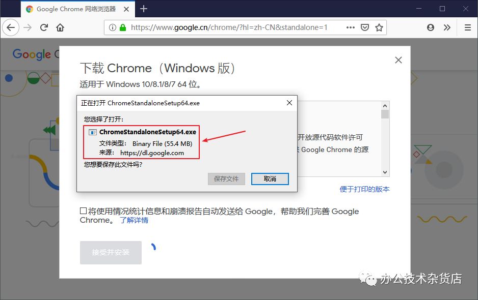步骤 3:如上图,这里可见下载的文件默认文件名字为ChromeStandaloneSetup64.exe,大小为55MB左右,和默认的在线安装包文件名和大小都不一样
