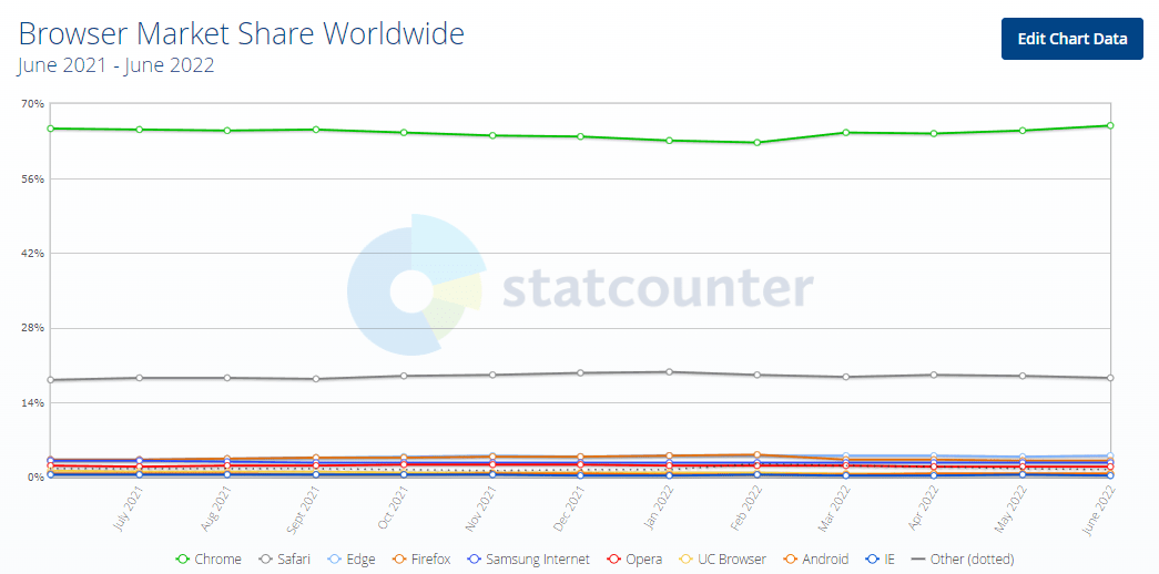 Statcounter近期发布的浏览器使用数据也可以看到Chrome高居榜首