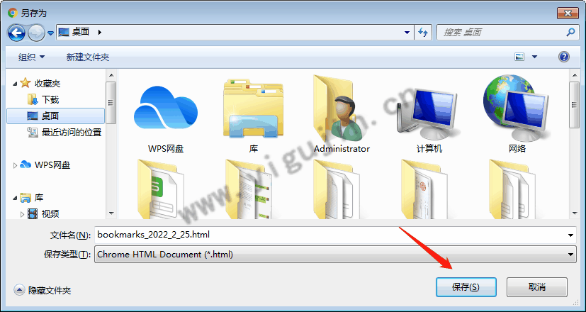 3、选择保存路径及设置文件名(也可默认),最后点击【保存】按钮即可成功导出书签。