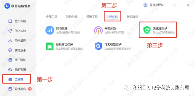 1、打开联想管家,依次按下图步骤点击工具箱--上网优化--浏览器保护。