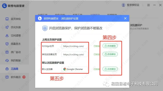 2、先把【上网主页保护设置】和【默认浏览器设置】依次解锁,如下图示,我输入的的主页为bing搜索页,默认浏览器选择了谷歌浏览器。所有都编辑好后,再重新锁定。操作比较简单,便不一一放图出来了。