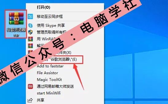 我们通过网盘下载谷歌浏览器安装包,如果电脑本身没有网盘的我们要先下载网盘安装然后再从网盘下载谷歌浏览器安装包到自己的电脑上,下载好之后我们选中谷歌浏览器安装包,然后鼠标右击选择解压到谷歌浏览器,如下图所示:
