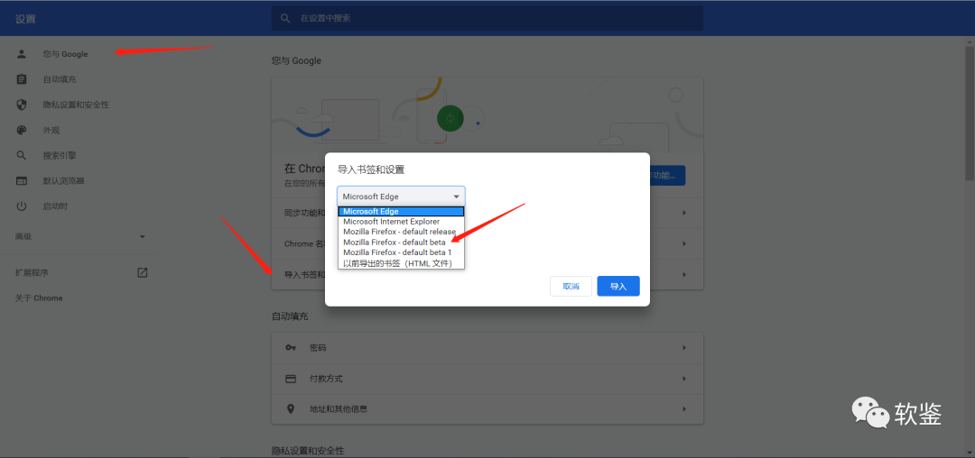 另外,大家可能会舍不得以前自己的浏览器上保存的一些书签和密码,这点不用担心,chrome细心地为我们提供了书签和密码的导入方式,我们打开设置,按照如下操作就可以导入书签啦。