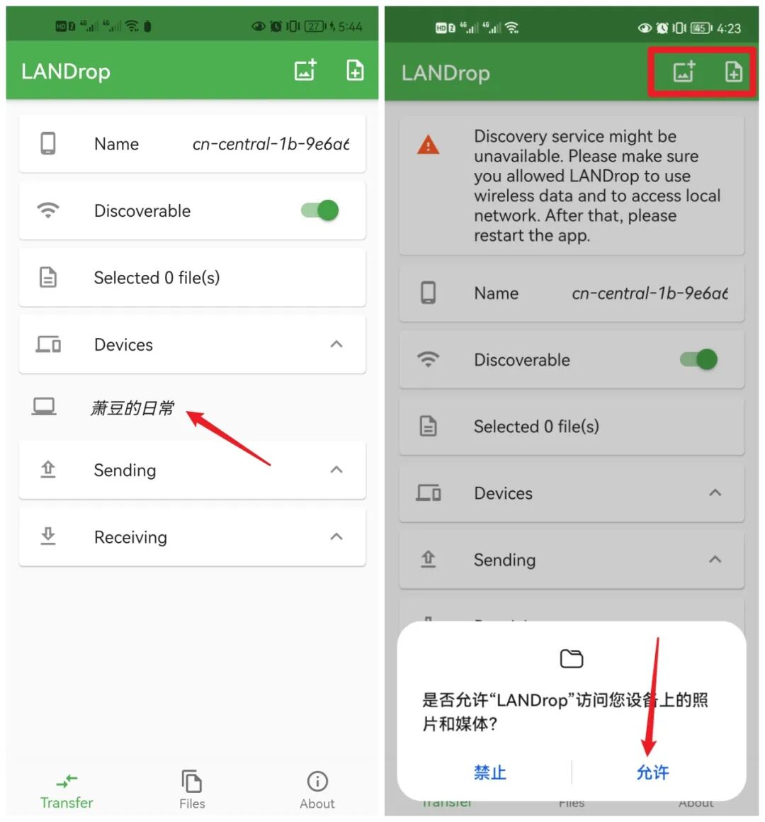 如果软件出现提示服务器无法使用的情况,我们手机退出重启软件即可,手机使用时,需要开启访问相册的权限,右上角两个功能则是上传图片、视频、文件的按钮。