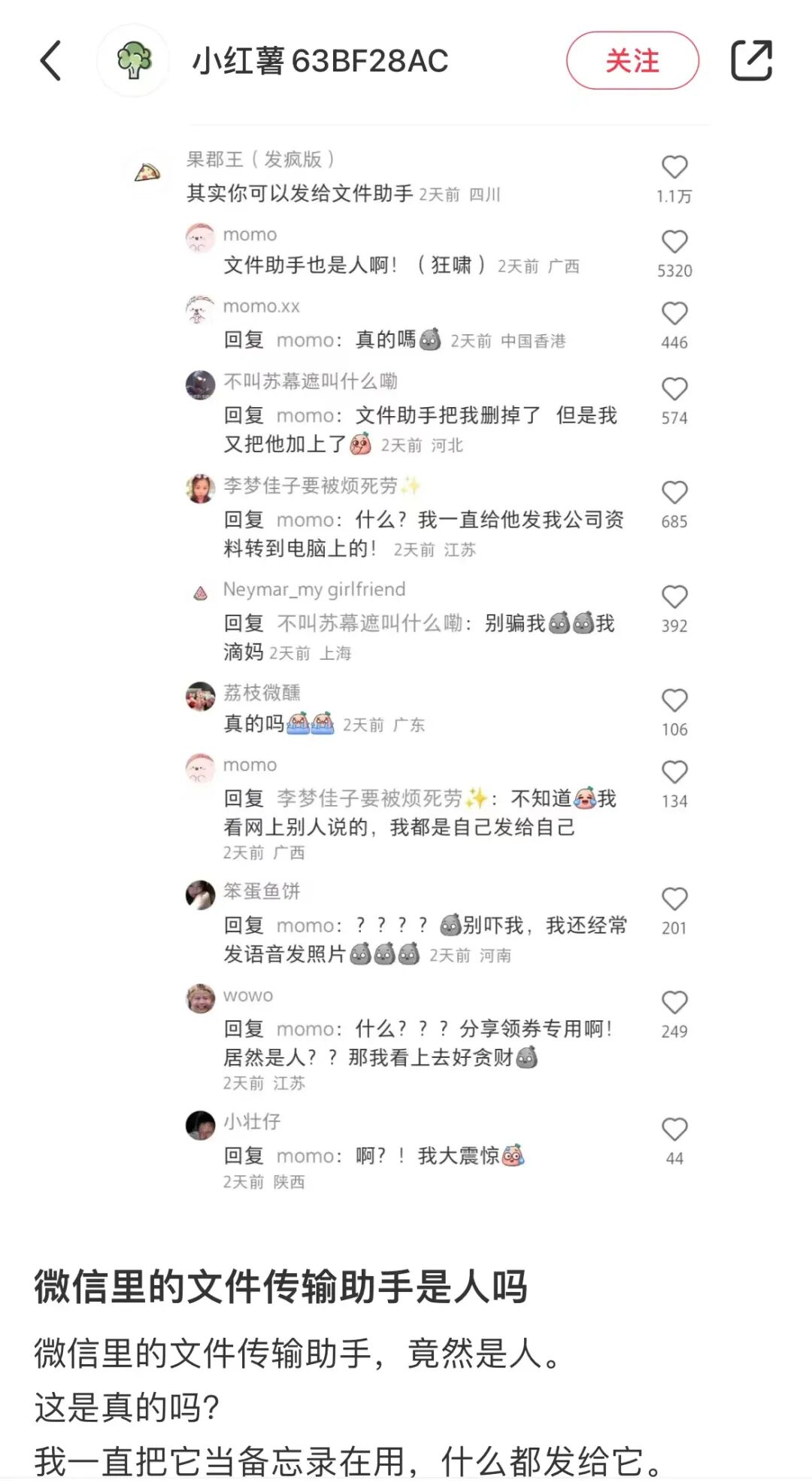 但最近,有个微信文件传输助手为真人的消息引起了广大网友的讨论。