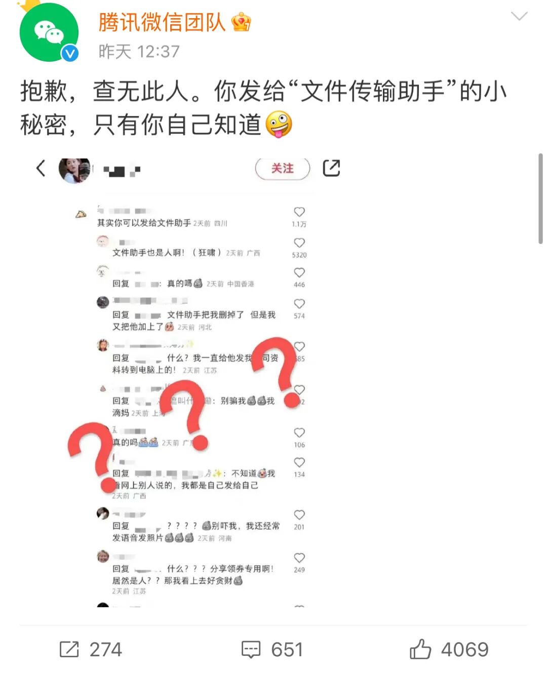 微信官方当然也不含糊,腾讯微信团队火速进行了辟谣,称:抱歉,查无此人。你发给文件传输助手的小秘密,只有你自己知道。