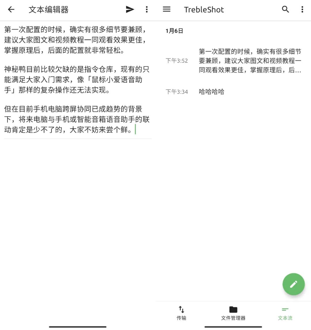 其次,TrebleShot 也支持【传输文本】,并且速度很快,可以当作剪贴板共享功能来用。