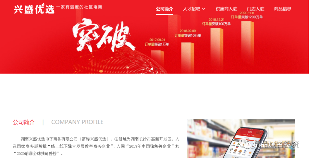 分析:6个字符的声母域名,代表兴盛优选商城。而四拼域名xingshengyouxuan.com则是被一家叫星盛优选的企业建站了。