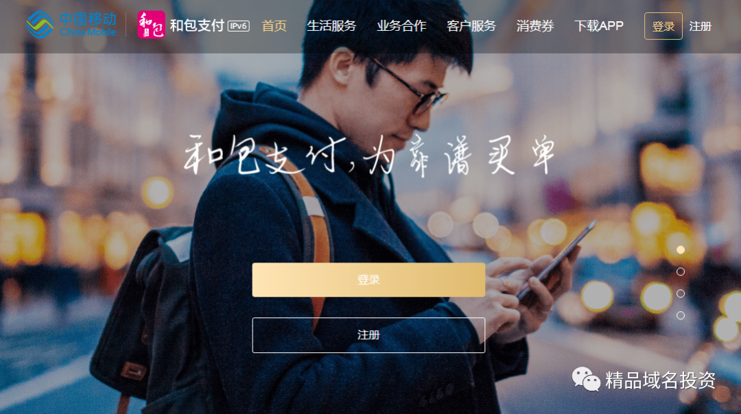 分析:属于组合域名,由cmChina Mobile+pay支付组成,契合品牌,也较简短利于记忆。