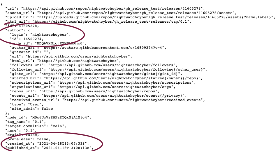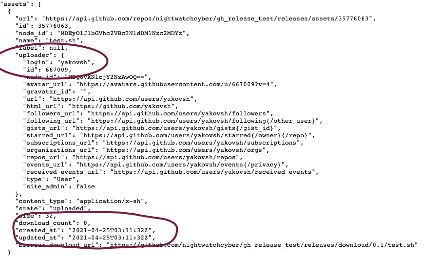 GitHub 提供的 release API 确实会暴露关于 release 资产的其它信息,被用于查看某 release 是否被修改。这种信息包括上传者的用户名以及上传时的时间戳。这些信息均可和主要的 release 元数据进行比对。