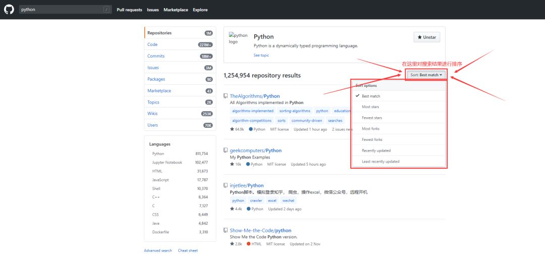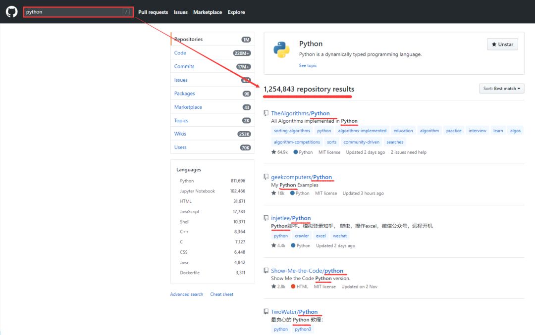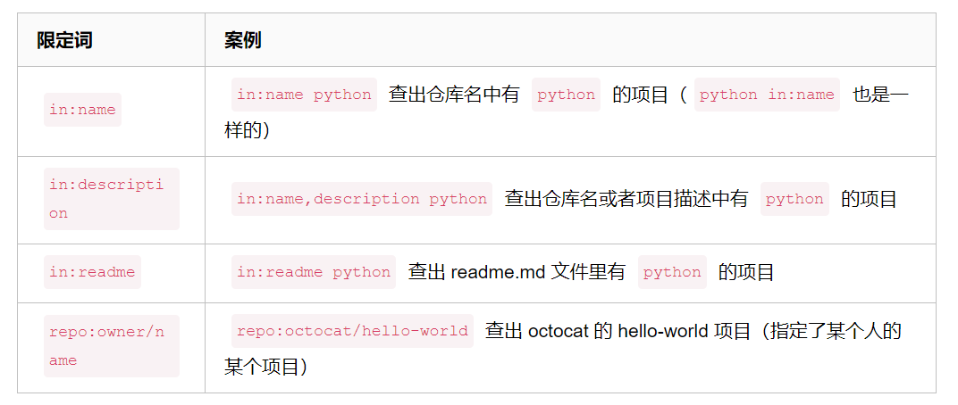 项目名字(name)里有 python 的in:namepython名字(name)里有 python 的并且 stars 大于 3000 的in:namepythonstarts:>3000名字(name)里有 python 的并且 stars 大于 3000 、forks 大于 200 的in:namepythonstarts:>3000forks:>200详情(readme)里面有 python 的并且 stars 大于 3000 的in:readmepythonstarts:>3000描述(description)里面有 python 的并且 stars 大于 3000 的in:descriptionpythonstarts:>3000描述(description)里面有 python 的并且是 python 语言的in:descriptionpythonlanguage:python描述(description)里面有 python 的并且 2019-12-20 号之后有更新过的in:descriptionpythonpushed:>2019-12-20PS: 按惯例,发推广都会发个红包,so,抢红包啦~