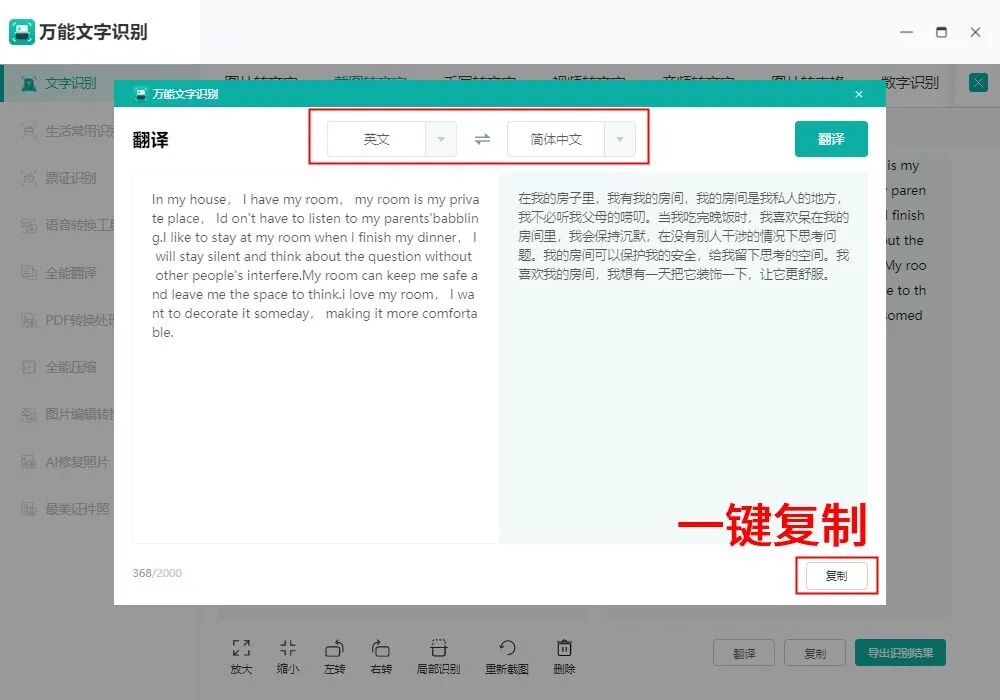 点击【翻译】按钮便会弹出翻译界面,接着设置互译的语言即可快速翻译,最后点击【复制】将翻译好的内容导出即可。