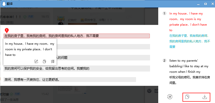 截取需要的范围后系统便会自动翻译,最后点击【复制】、【下载】按钮将文字导出即可。