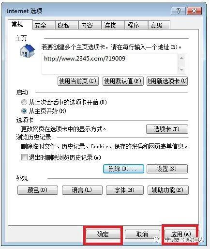 4. 界面将自动返回至Internet选项的常规一栏,依次点击应用、确定,此时删除缓存操作完成重新登录浏览器即可。