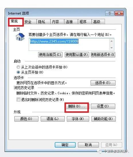 2. 在弹出的Internet选项界面中,选择常规一栏,点击删除按钮