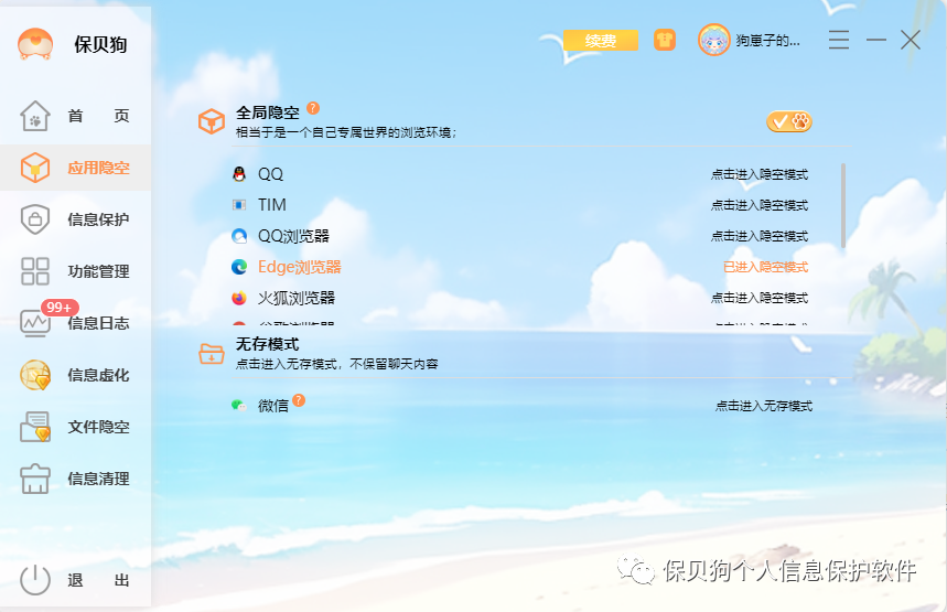 保贝狗的无痕浏览就是应用隐空中的全局隐空模式,隐空模式相当于是一个给浏览器加强的无痕模式,它既有无痕模式的一切效果和功能,又能有正常模式下的信息数据记录,这个优点就体现在你自己搜索的数据信息等记录,只能你自己在隐空模式下看见,防止第三方直接查询你的搜索记录和下载记录等信息。