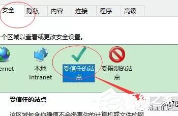 2、在安全选项卡,选择受信任站点,单击站点按钮。