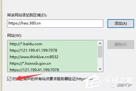 3、打开兼容性视图设置窗口,输入网站地址,单击添加按钮,网址就自动添加到下面的列表中,并勾选在兼容性视图中显示Internet站点。