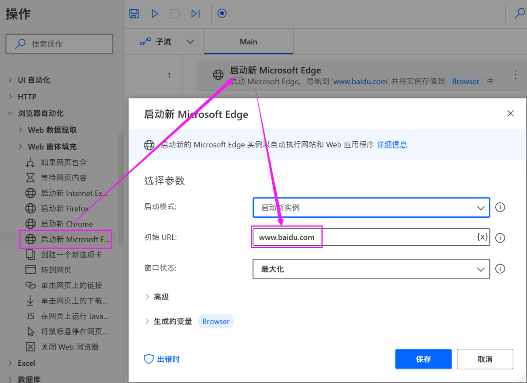 添加启动新Microsoft Edge步骤,并输入要打开的网址: