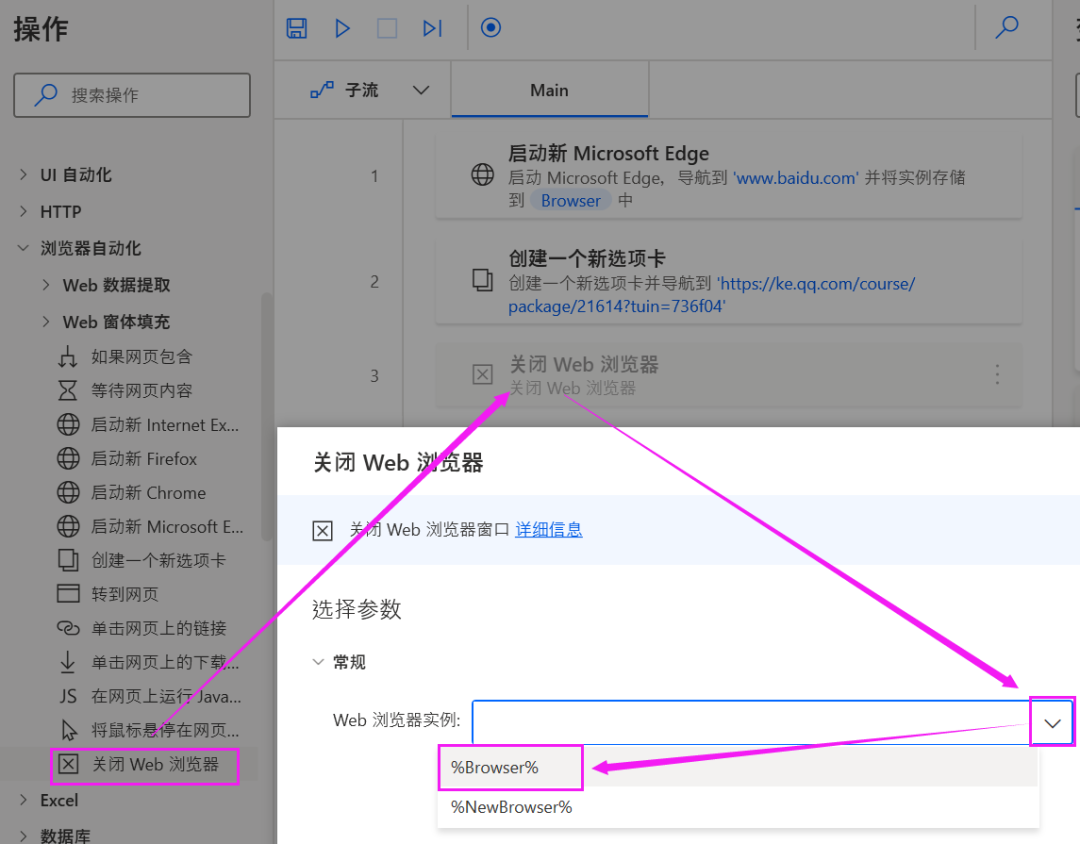 如果说,我们在操作过程中可能会切换页面,甚至是,因某些特殊的原因,加入了一些人工干预又增加或改变了页面,这时,我们希望Power Automate能直接关闭当前页面,那该怎么办?