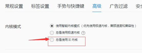 3)在内核选项下,选择总是使用IE内核。