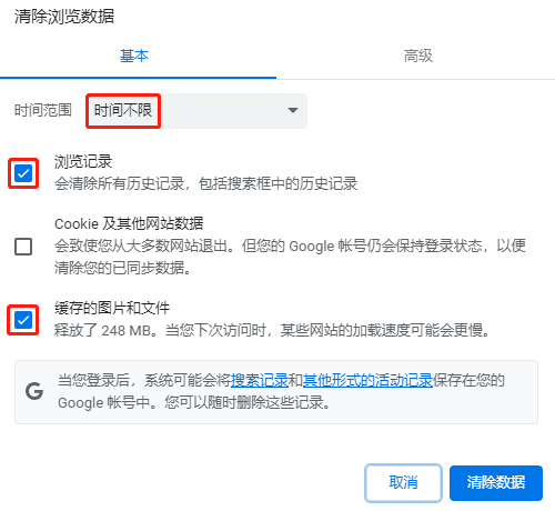 时间范围选择时间不限,勾选浏览记录和缓存的图片和文件两个选项后点击清除数据按钮。缓存数据清除后清除浏览数据窗口会自动关闭,重启浏览器后再次打开之前的页面就可以正常操作了。