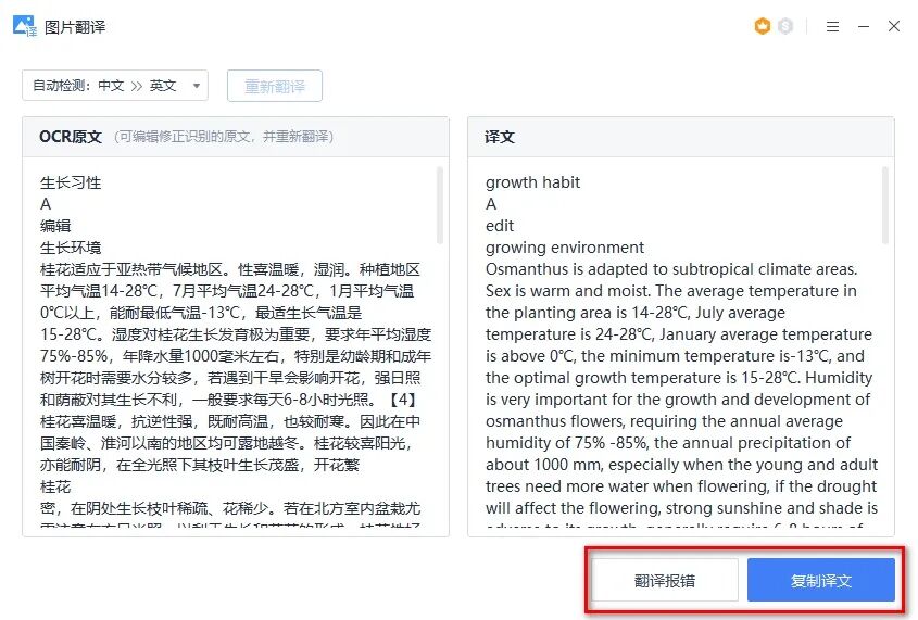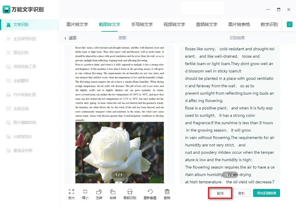 接着根据实际需要翻译的内容调整截图大小,点击立即识别按钮,软件很快就能将图片中的文字内容提取出来,然后直接点击下方的翻译按钮开始翻译。