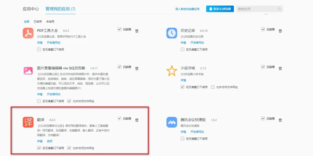 如果找不到翻译功能,就在浏览器的右上角找到应用中心,进入之后选择管理我的应用,找到翻译插件,勾选启用选项即可。