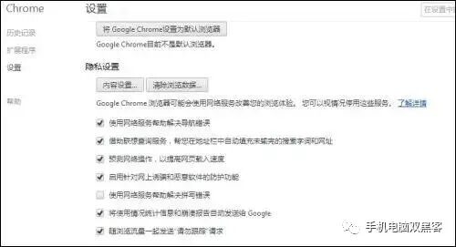 作为互联网时代的大鳄,谷歌Chrome也提供了请勿跟踪功能,我们在chrome中进入设置,选择高级设置,在隐私设置的最后一项,勾选随浏览流量一起发送请勿跟踪请求即可。