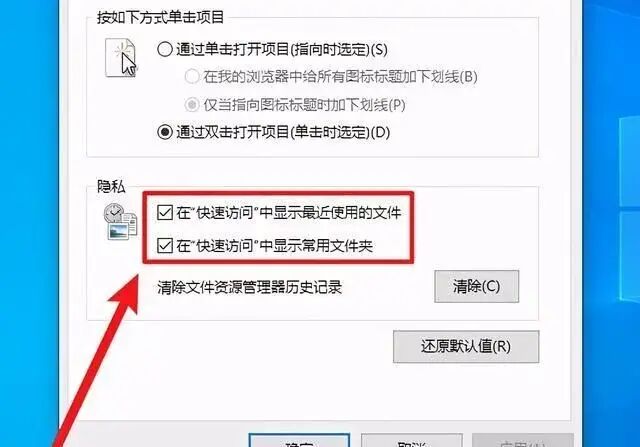 3、如果你不想让文件夹显示记录信息,那在这里我们还可以这样设置,把快速访问前面的勾去掉,以后在文件夹就不会再显示任何浏览记录了: