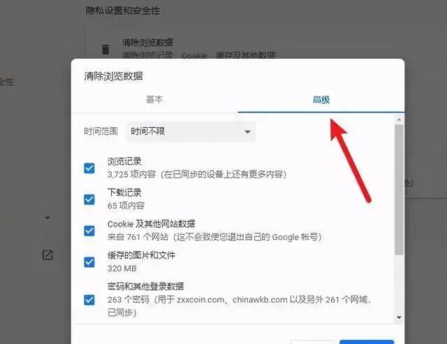 5、如果并不是需要删除所有数据,那么还可以选择高级,在高级里有更详细的删除选项,选择自己只需要删除的项目,然后点击清除数据即可: