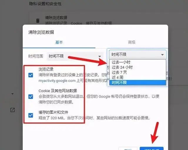 4、点击清除浏览器数据后,在这里我们可以选择时间范围,可清理的数据包括浏览记录、cookie及其他网站数据、缓存的图片和文件,选择后点击右下角清除数据即可完成删除: