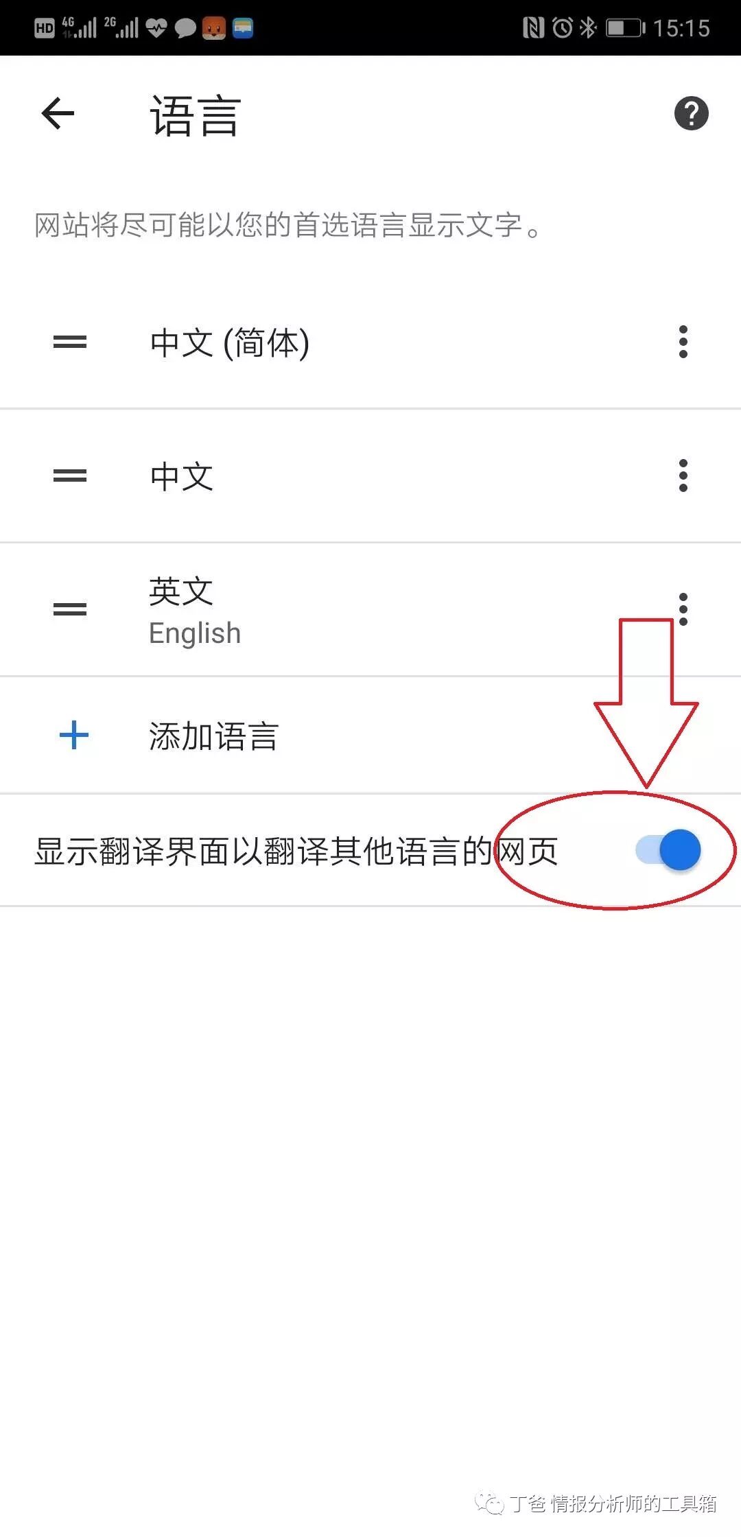 4、在语言设置页面,打开显示翻译界面以翻译其他语言的网页功能。