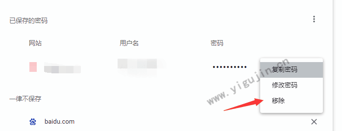 2、点击记住账号密码的网站右侧对应竖着的三个小圆点图标按钮 >> 点击移除即可取消删除谷歌浏览器记住的该网站账号和密码,也可以点击修改密码或复制密码等操作。