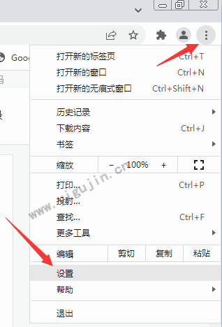 1、打开谷歌浏览器Chrome >> 点击右上角竖着的三个小圆点图标按钮 >> 点击下来菜单中的设置。