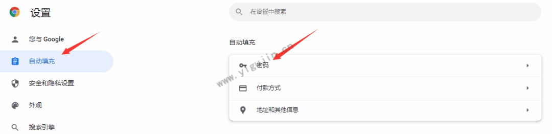 2、点击左侧导航菜单自动填充>> 点击密码。