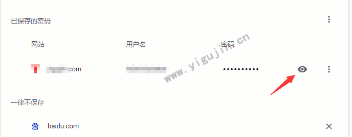 1、根据上文步骤进入到密码设置页面后,在已保存的密码中可以看到已经被谷歌浏览器记住账号和密码的网站及对应的用户名和密码,点击密码旁边的眼睛图标按钮并输入电脑开机密码(若有)后即可看到实际的密码是多少。