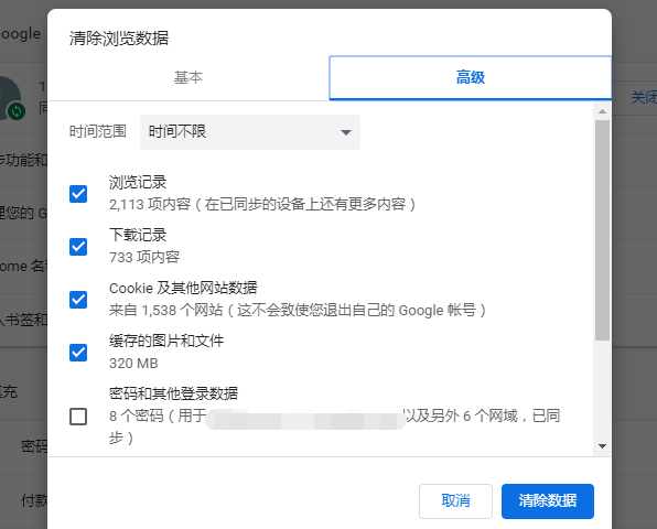 选择要清除的内容和时间,单击清除浏览数据即可。