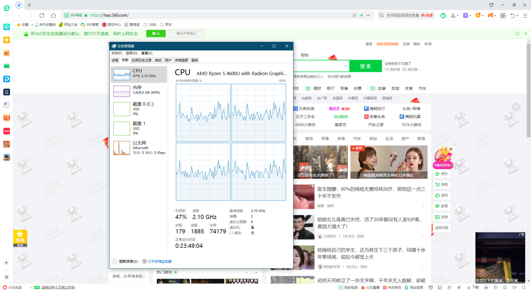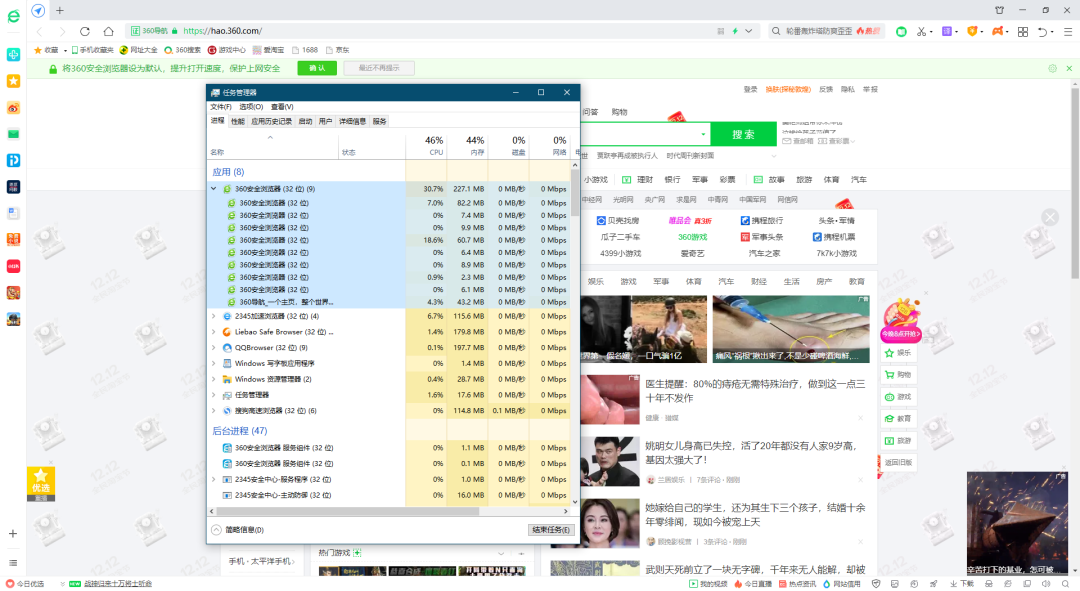 我把这五款浏览器同时开启,都打开了一个浏览器主页,就这样在什么都不干的情况下,瞬间占用了近一半的CPU资源,而光360安全浏览器就占用了30%。