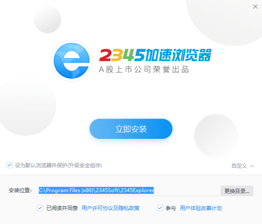 1、安装过程自动勾选设置默认浏览器并保护(升级安全组件),以及参与用户体验改善计划,后一项同样需要点击自定义安装才能看到。