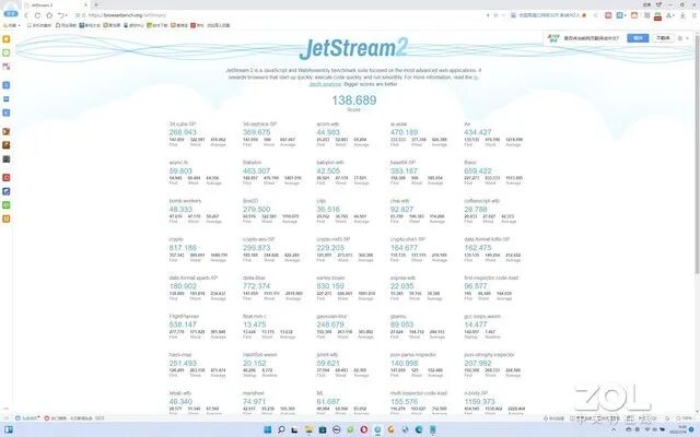 首先是Java脚本性能测试JetStream2,该项测试包含了59项各类Java脚本相关独立测试项,每个测试项会给出最高分、最低分和平均分,最终会给出一个总成绩。