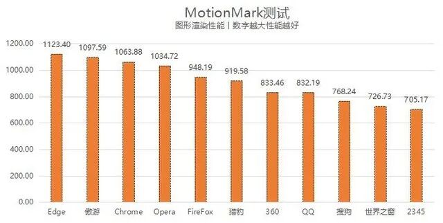 在这项测试中,Edge浏览器以1123.4分排名第一,傲游浏览器得分1097.59排名第二,Chrome浏览器得分1063.88排名第三,排名最后三位的分别是2345、世界之窗以及搜狗。