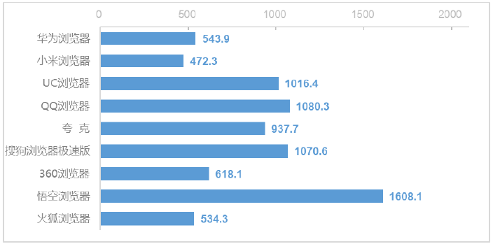 (1)9款App在用户完成一次网站浏览活动(启动App、搜索信息、打开网站)时,上传数据流量平均⁽⁴⁾最多的为悟空浏览器,约为1608KB;平均最少的为小米浏览器,约为472KB。具体情况如图1。