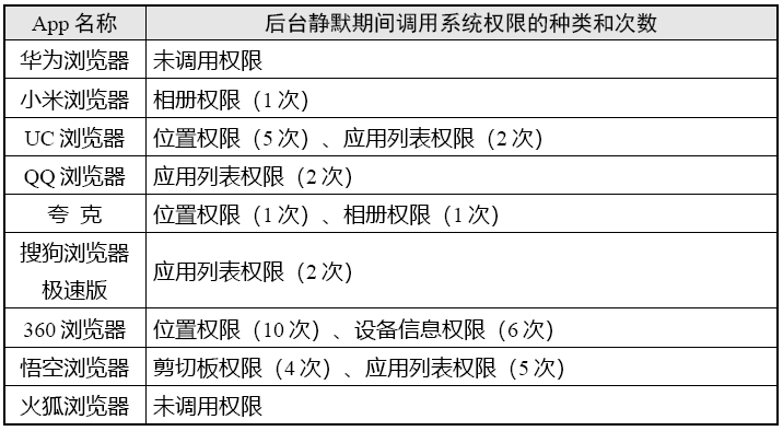 (4)在后台静默场景中,调用系统权限种类最多的为UC浏览器、夸克、360浏览器、悟空浏览器(均为2类),调用系统权限次数最多的为360浏览器(16次)。具体情况如表5。