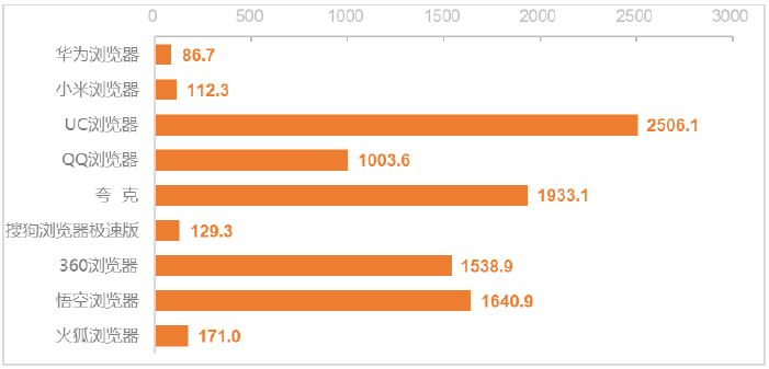 (3)9款App后台静默12小时,上传数据流量平均⁽⁶⁾最多的为UC浏览器,约为2506KB;平均最少的为华为浏览器,约为87KB。具体情况如图3。