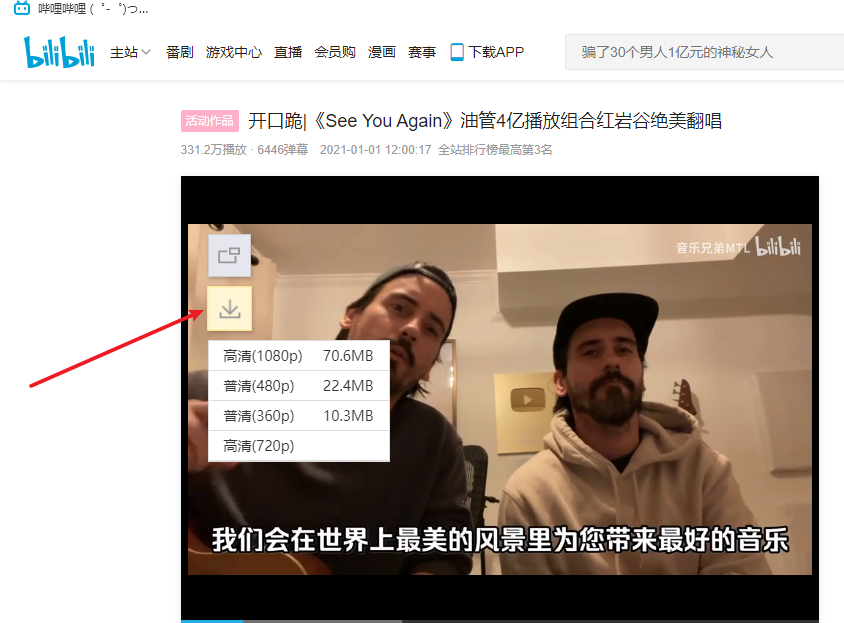 二,自带视频下载按钮,可下载bilibili,Youtube等网站视频。打开B站。打开视频,可以直接下载视频,简单支持1080P下载。