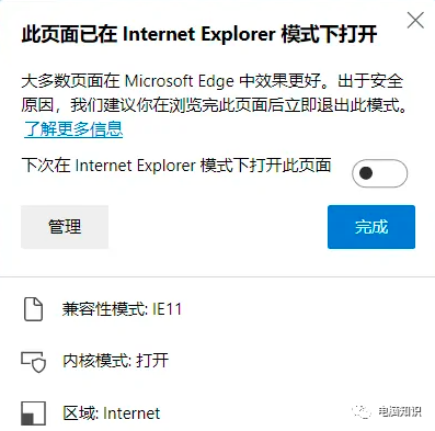 5、该网站在edge浏览器中已经在Internet Explorer 模式下打开。可以在弹出的界面中设置管理之后是否默认此模式开启该网站。